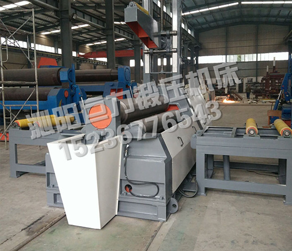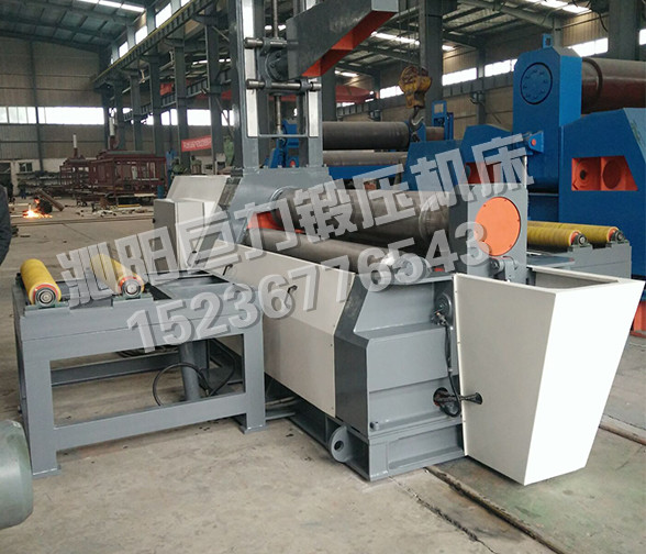 該四輥卷板機(jī)與對(duì)稱三輥卷板機(jī)比較,它可以不借助其它設(shè)備模具,直接予彎板材端部,而且剩余直邊較小;它可以不使板材調(diào)頭,而卷成工件。